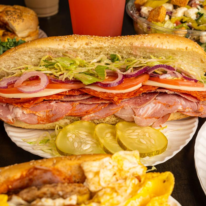 Salami, pepperoni, cap, Provolone, lettuce, tomato, red onion, and oil and vinegar