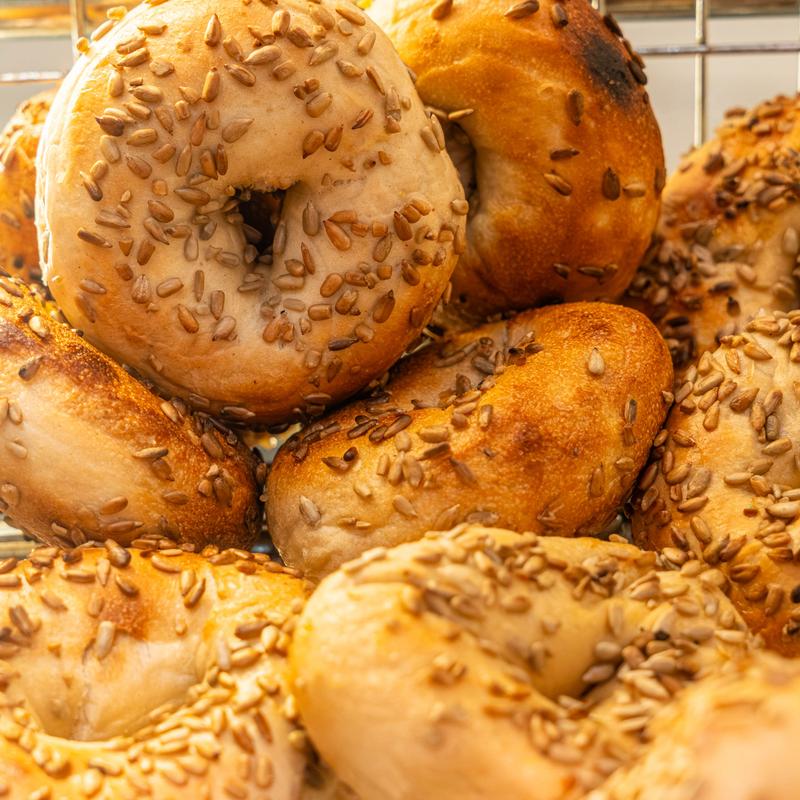 Everything bagel with 2 eggs, bacon, Cheddar, hot honey, and scallion cream cheese
