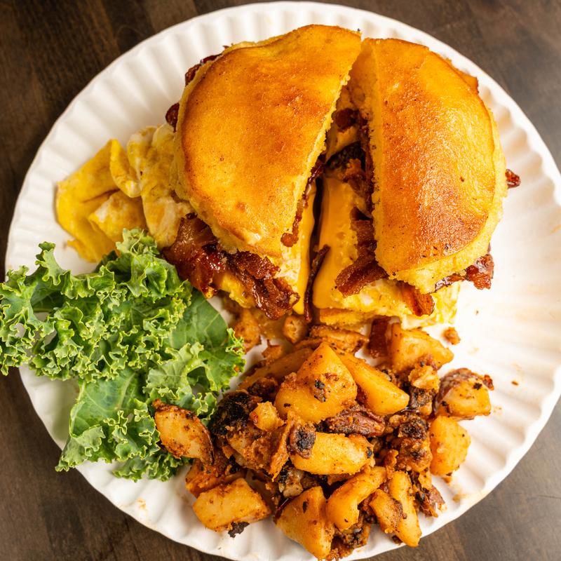Your choice of meat, 2 eggs, and cheese sandwiched between 2 syrup battered pancakes