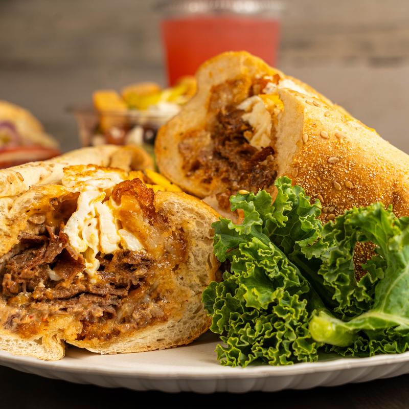 3 eggs, steak, Cheddar, 2 hashbrowns, and chipotle mayo on a hero